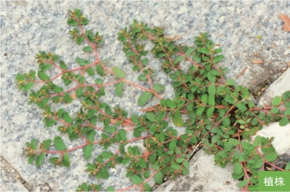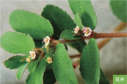 形态特征:一年生草本。茎平卧,自基部以上多分枝,常带红色或淡红色。叶对生;叶片长圆形或倒卵状长圆形,长5~12毫米,宽3~7毫米,顶端钝圆,基部偏斜,边缘具细锯齿。杯状聚伞花序单生于叶腋;总苞陀螺状,浅红色,边缘4裂;腺体4枚,边缘具白色或淡红色附属物。雄花5~8枚,雌花1枚。蒴果三棱状卵球形,直径约2毫米。种子褐色,三棱状卵球形,长约1.3毫米,直径约0.9毫米。花期6—9月,果期7—10月。