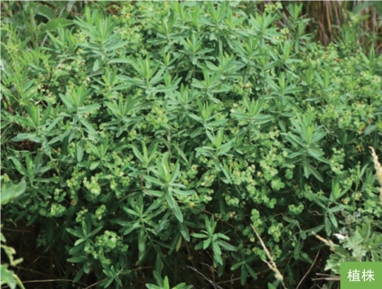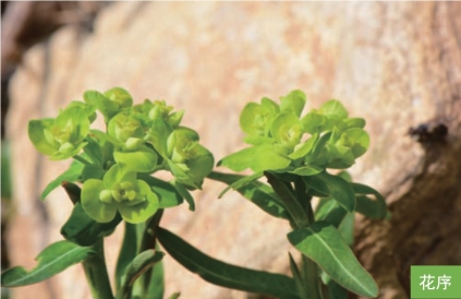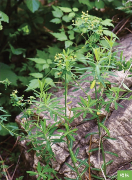 形态特征:多年生草本,高30~50厘米。根粗壮,圆柱状,褐色。茎直立,常数茎丛生。叶互生;无柄;叶片狭长圆形、长圆状披针形或长圆状倒披针形,长2~6厘米,宽4~12毫米,边缘全缘;聚伞花序顶生;总苞叶4~7枚;伞幅6~8;杯状聚伞花序单生于二歧分枝顶端,总苞杯状,边缘4裂,腺体4枚,半圆形或肾状圆形。蒴果球状,直径约4毫米,被稀疏的瘤状突起。种子暗褐色,卵圆形,长约2毫米。花期5—6月,果期6—7月。