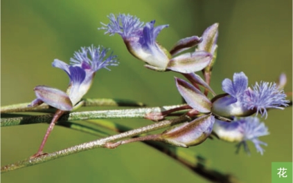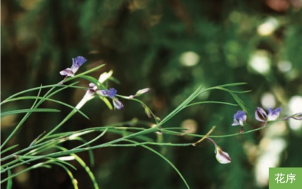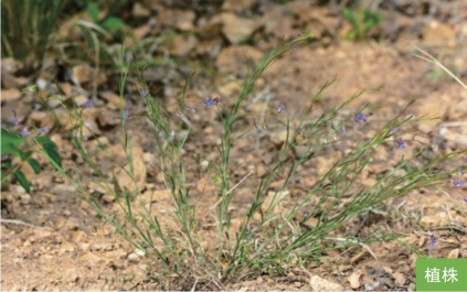 形态特征:多年生草本,高15~40厘米。主根粗壮,浅黄色。茎多数丛生,直立或倾斜。单叶互生;叶片线形至线状披针形,长1~3厘米,宽1~3毫米,两端变狭,全缘。总状花序顶生,常偏向一侧,长5~14厘米;花较稀疏,淡蓝色至蓝紫色;萼片5枚,宿存,外面3枚线状披针形,里面2枚花瓣状;花瓣3枚,侧瓣基部与龙骨瓣合生,龙骨瓣具流苏状附属物。蒴果扁平,近圆形,直径约4毫米,顶端微凹,具狭翅。种子黑色,卵形,直径约2毫米,密被白色柔毛。花果期6—10月。