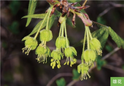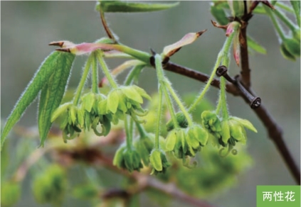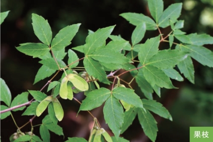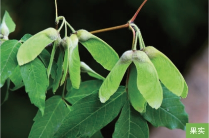 形态特征:落叶乔木,高达10米。树皮灰褐色,常成薄片状脱落。当年生枝紫色或淡紫色,老枝淡紫褐色。叶对生;三出复叶,小叶片长圆状卵形或长圆状披针形,长5~9厘米,宽2~4厘米,边缘上部有1~3对粗的钝锯齿。伞房花序,3朵花聚生;花杂性,雄花与两性花异株;萼片5枚,黄绿色;花瓣5枚,黄绿色。翅果成熟时黄褐色,长约4.5厘米。小坚果凸起,近于球形,直径约1厘米,密被淡黄色柔毛。果翅黄褐色,张开成锐角或近于直角。花期4—5月,果熟期9月。