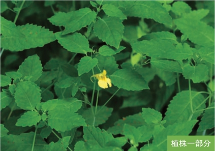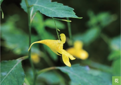 形态特征:一年生草本,高40~80厘米,全株无毛。茎肉质,直立,下部节常膨大。叶互生;叶片卵形或卵状椭圆形,长3~10厘米,宽1.5~5厘米,边缘有粗齿。总状花序腋生,具2~4朵花;花大,黄色或淡黄色;萼片3枚,侧生萼片2枚,淡绿色,中部萼片花瓣状,宽漏斗形,具细而内卷的距,有时具红紫色斑点;花瓣5枚,翼瓣有时具红紫色斑点。蒴果线状圆柱形,长1~2厘米。种子深褐色,长圆状球形,长3~4毫米。花期6—9月,果期7—10月。