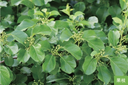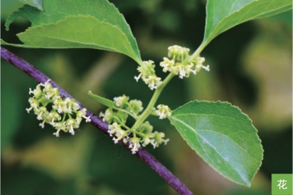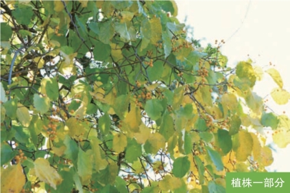 形态特征:落叶灌木或藤本,长达10余米。树皮灰褐色。小枝灰棕色或棕褐色。单叶互生;叶片通常宽倒卵形或近圆形,长5~13厘米,宽3~9厘米,边缘具锯齿。聚伞花序顶生或腋生,具5~7花;花杂性;花萼5枚;花瓣5枚,淡绿色。蒴果成熟时橙黄色,近球形,直径8~10毫米,顶部有刺尖。种子白色,有深红色肉质假种皮,椭圆状稍扁,长4~5毫米。花期5—7月,果期8—9月。