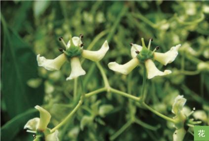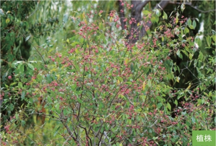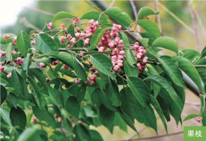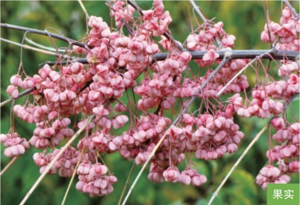 形态特征:落叶小乔木,高达8米。树皮灰色,光滑,老时浅裂。小枝绿色。叶对生;叶片卵状椭圆形、卵形,长5~10厘米,宽3~8厘米,边缘具细锯齿。聚伞花序,具3~7朵花;萼片4枚;花瓣4枚,淡白绿色或黄绿色。蒴果成熟后果皮粉红色,倒圆心状,4浅裂,长6~8毫米,直径9~10毫米。种子长椭圆状,长5~6毫米,种皮棕黄色,假种皮橙红色。花期5—6月,果期9月。
