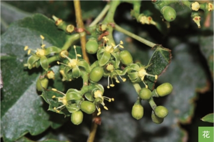 形态特征:落叶藤本。小枝土褐色。卷须5~9分枝,与叶对生,卷须顶端具圆形吸盘。单叶互生,在短枝端2叶呈对生状;叶片倒卵圆形,长5~20厘米,宽8~17厘米,顶端常3浅裂,边缘有粗锯齿。多歧聚伞花序常腋生于短枝端;花两性,黄绿色;萼片5枚;花瓣5枚。浆果成熟时蓝黑色,球形,直径6~8毫米。种子倒卵圆形,顶端圆形,基部急尖成短喙。花期6—7月,果期9—10月。
