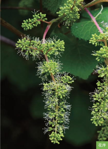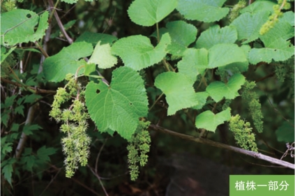形态特征:落叶藤本,长15米以上。嫩枝淡紫红色、绿色或黄褐色,疏被蛛丝状绒毛。卷须2~3分枝,与叶对生。单叶互生;叶片宽卵圆形,长6~24厘米,宽5~21厘米,不分裂或3~5浅裂或中裂,边缘有粗锯齿,齿端有尖头。花单性,雌、雄异株;圆锥花序与叶对生;花小,多数,黄绿色。浆果成熟时黑色或黑蓝色,球形,直径约8毫米。种子倒卵圆形,顶端微凹,基部有短喙。花期5—6月,果期8—9月。