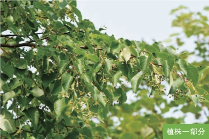 形态特征:落叶乔木,高达30米。树皮暗灰色,浅纵裂,片状脱落。当年生枝绿色或带淡褐色。单叶互生;叶片宽卵形或卵圆形,长4~8厘米,宽4~7厘米,顶端急尖或渐尖,基部心形,边缘有锯齿,齿顶端具内弯的芒尖。聚伞花序,具3~20朵花;萼片5枚,两面被短柔毛;花瓣5枚,黄白色。核果球形,直径3~5毫米,被褐色短柔毛。种子褐色,倒卵形,长约5毫米。花期6—7月,果熟期9月。