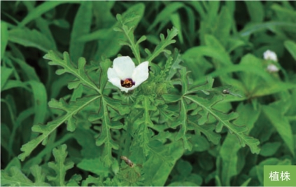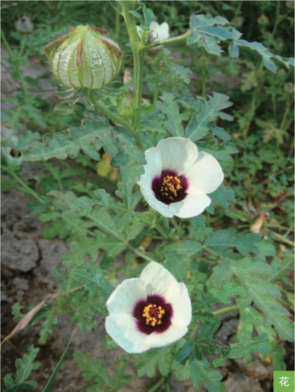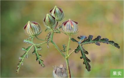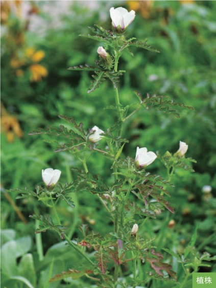 形态特征:一年生草本,高20~70厘米。茎直立,多分枝。叶互生;茎近基部的叶圆形,不分裂;茎上部叶掌状3~5深裂,直径3~6厘米,中裂片较长,两侧裂片较短,裂片通常羽状全裂,两面疏被粗硬毛。花单生于叶腋;萼片5裂,淡绿色,具紫色脉纹;花瓣5枚,淡黄色,基部紫色。蒴果长圆状球形,直径约1厘米,被粗硬毛,果5枚,果皮薄,黑色。种子肾形,黑色,具腺状突起。花期7—9月,果期8—10月。