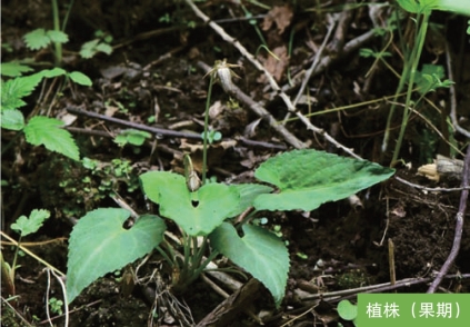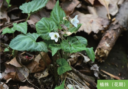 形态特征:多年生草本,高5~15厘米。根状茎较细,近白色,散生数条白色根。叶基生;叶片卵形或狭卵形,长2~5厘米,宽1~3厘米,果期变大,顶端尖或尾状渐尖,基部深心形,花期表面常具白斑。花白色,长1.7~1.9厘米;距圆筒状,长5~7毫米,直,末端圆。蒴果椭圆形,长7~11毫米,无毛。花果期4—7月。