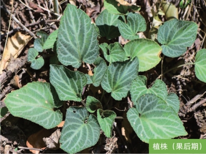 形态特征:多年生草本,高3~12厘米。根状茎短而细,具数条淡褐色或近白色长根。叶基生,莲座状;叶片圆形或圆卵形,长1~8厘米,宽1~6厘米,顶端圆形或钝,基部心形,表面暗绿色或绿色,沿叶脉有白色斑纹,背面稍带紫红色,果期叶片增大。花红紫色或暗紫色,下部通常色较淡,具紫色脉纹。蒴果椭圆形,长约7毫米。种子淡褐色,长约1.5毫米。花期4—7月,果期6—8月。