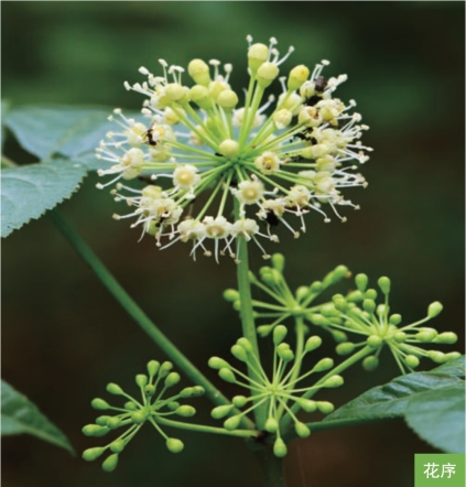 形态特征:落叶灌木,高1~3米。一年或二年生的通常密生刺。掌状复叶互生;小叶5枚,稀3枚或4枚,小叶片椭圆状倒卵形或长圆形,长5~13厘米,宽3~7厘米,边缘有锐利重锯齿。伞形花序单个顶生或2~6个簇生;花淡黄色或紫黄色;萼边缘近全缘或有不明显的5小齿;花瓣5枚。浆果状核果成熟时黑色,近球形,有5棱,直径7~8毫米。花期7—8月,果期8—10月。