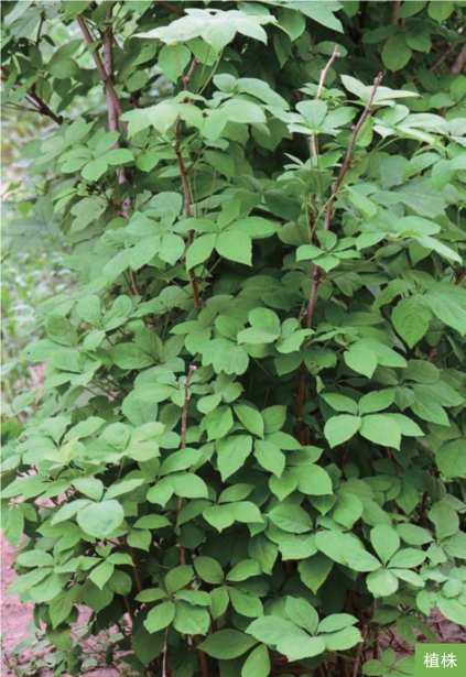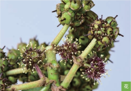 形态特征:落叶灌木或小乔木,高1.5~3.5米。树皮灰色至暗灰色,有纵裂纹。枝灰色,无刺或疏生刺。掌状复叶互生;小叶3~5枚,小叶片倒卵形或长圆状倒卵形至长圆状披针形,稀椭圆形,长8~18厘米,宽3~9厘米,边缘有不整齐锯齿。头状花序紧密,球形,通常4~6个多至10个再组成顶生圆锥花序或伞形花序;萼密生白色绒毛,边缘有5小齿;花瓣5枚,暗紫色。浆果状核果成熟时黑色,倒卵状椭圆形,长1~1.5厘米。花期8—9月,果期9—10月。