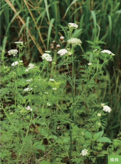 形态特征:一年生草本,高30~80厘米。茎直立,中空。茎生叶互生;茎下部叶具短柄,基部鞘状,叶片轮廓卵形至三角状卵形,二至三回三出式羽状全裂;茎中部叶及上部叶叶柄全呈鞘状,抱茎,边缘带白色。复伞形花序顶生或腋生,伞辐10~30;小伞形花序具花10~20余朵,花瓣白色,顶端具内折小舌片。双悬果宽椭圆形,长1.5~3毫米,宽1~2毫米,果棱宽翼状。花期6—7月,果期7—8月。