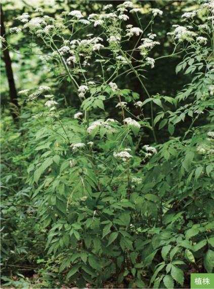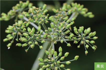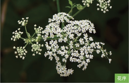 形态特征:多年生草本,高0.8~2米。茎直立,粗壮,中空,上部分枝。基生叶及茎下部叶有长柄,基部鞘状,叶片长20~45厘米,二至三回三出羽状全裂,终裂片叶状,边缘有不整齐的粗锯齿;茎上部叶叶柄短,全呈鞘状,叶片简化。复伞形花序,伞辐5~14;总苞片1~3枚;小伞形花序有花8~20朵,花瓣白色。双悬果成熟时金黄色,宽椭圆形,长4~6毫米,宽3~4毫米,背棱细狭,侧棱宽翅状,宽约1毫米。花期8—9月,果期9—10月。