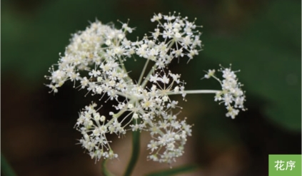 形态特征:多年生草本,高50~100厘米。茎直立,节部被密毛。茎生叶互生;基生叶及茎中、下部叶有柄,基部狭鞘状,抱茎,最上部叶叶柄全为鞘状;叶片一至二回三出复叶,小叶片卵形或宽卵形,长3~8厘米,宽4~6.5厘米,边缘有钝齿或锯齿。复伞花序顶生,伞辐7~15;小伞形花序有花15~20朵,花瓣白色,顶端微凹,有内折的小舌片。双悬果近球形,两侧稍扁,果棱线形。花期7—8月,果期8—9月。