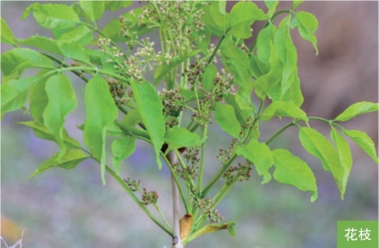 形态特征:落叶乔木,高达15米。树皮灰色或暗灰色,光滑,老时浅裂。叶对生;奇数羽状复叶,长达30厘米;小叶3~7枚,通常5枚,宽卵形、倒卵形或卵状披针形,长5~15厘米,宽2~7厘米。圆锥花序顶生或腋生于当年生枝梢,花杂性或单性异株;花萼浅杯状,4裂;无花冠。翅果倒披针形,长约3.5厘米,宽约4毫米,翅下延至坚果中部。花期5月,果熟期9月。