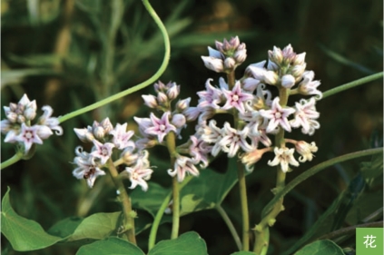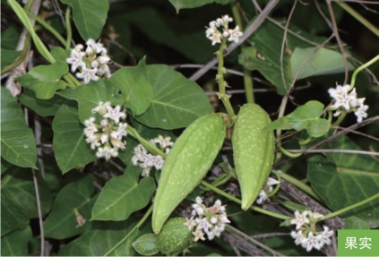 形态特征:多年生草质藤本,长达8米,具乳汁。茎圆柱状,淡绿色。叶对生;叶片卵状心形,长5~12厘米,宽4~8厘米,基部心形,顶端急尖,全缘。总状花序或总状聚伞花序腋生或腋外生;花萼5深裂;花冠白色,有淡红紫色斑纹,5浅裂。蓇葖果纺锤形,长8~9厘米,直径约2厘米,表面有瘤状突起。种子褐色,扁平,卵圆形,长6~7毫米,宽3~5毫米,顶端具白色绢质种毛。花期7—9月,果期8—10月。