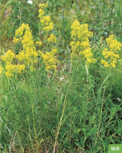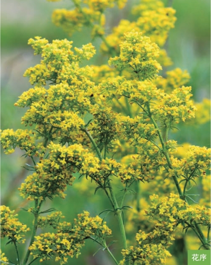 形态特征:多年生草本,高达1米。茎直立或斜升,基部稍木质化,近四棱形。叶6~10(~15)枚轮生;叶片线形,通常长1.5~5厘米,宽0.5~2毫米,顶端突尖或具芒刺,边缘反卷。聚伞花序顶生和腋生,较大,多花,通常在枝顶密集成圆锥花序状;花小,稠密;花冠黄色,4裂。小坚果近球形,双生,直径约2毫米,无毛。花期6—7月,果期7—8月。