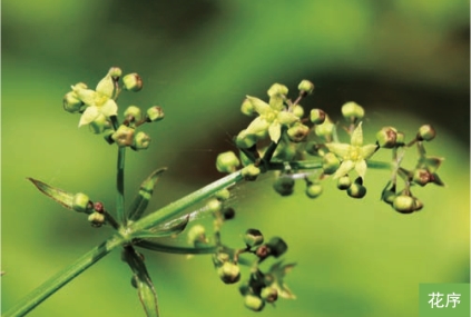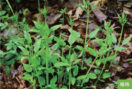 形态特征:多年生草本,高40~60厘米。须根发达,紫红色。茎直立,具4棱,沿棱具倒生小刺。叶4枚轮生;叶片宽卵形至长卵形,长3~11厘米,宽2~7厘米,边缘有密缘毛,两面或沿脉被短硬毛。聚伞花序顶生或腋生,通常再结成大型、带叶的圆锥花序;花小,黄白色或绿白色,直径4~5毫米。浆果黑色,近球形,直径约4毫米。花期6—7月,果期8—9月。