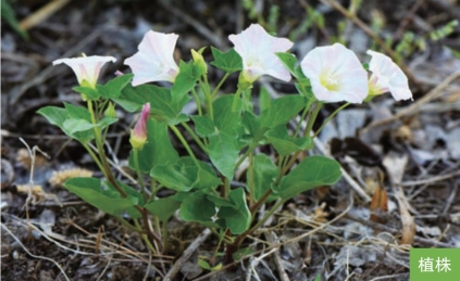 形态特征:一年生草本,高15~80厘米。茎匍匐,有时缠绕。叶互生;茎基部叶近全缘,卵状长圆形,基部戟形,顶端圆;茎上部叶片3~5裂,中裂片长圆形或长圆状披针形,侧裂片近三角形,基部心形或戟形。单花腋生;苞片宽卵形,长1~1.2厘米;萼片5枚;花冠淡紫色或淡红色,钟状。蒴果卵球形,长约1厘米。种子黑褐色,卵圆形,长4~5毫米,表面有小疣。花期5—7月,果期6—8月。