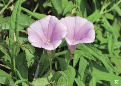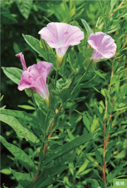 形态特征:多年生草本,全株被长柔毛。茎缠绕。叶互生;叶片长圆形或长圆状线形,长4~10厘米,宽0.5~2.5厘米,基部圆形、截形或微呈戟形,顶端钝圆或锐尖,具小刺尖,全缘。单花腋生;苞片卵形,长1.5~2.2厘米;萼片5枚;花冠粉红色,漏斗状。蒴果近球形,直径约6毫米。种子卵圆形。花期7—9月,果期8—10月。