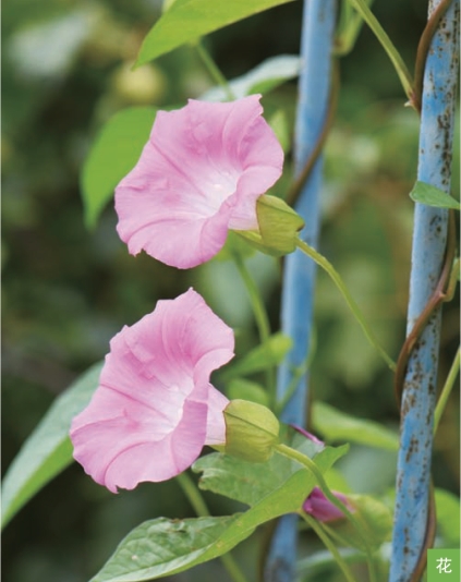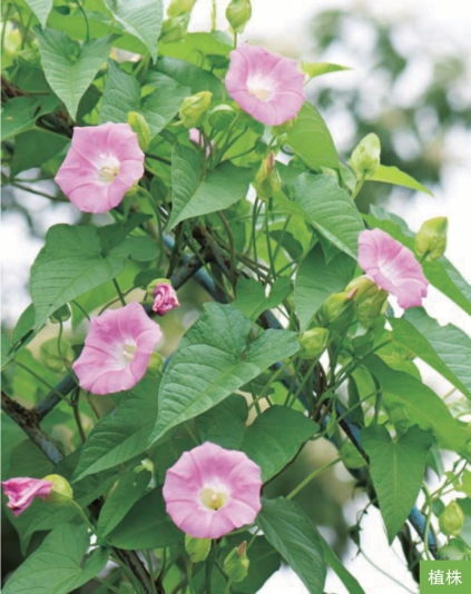 形态特征:多年生草本。茎缠绕。叶互生;叶片三角状卵形或宽卵形,长4~10厘米,宽3~8厘米,基部戟形或心形,顶端渐尖或锐尖,全缘或基部稍伸展为具2~3个大齿缺的裂片。单花腋生;苞片宽卵形,长2~2.8厘米;萼片5枚;花冠粉红或带紫色,漏斗状。蒴果球形,直径约1厘米。种子黑褐色,长约4毫米,表面有小疣。花期6—8月,果期8—9月。