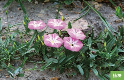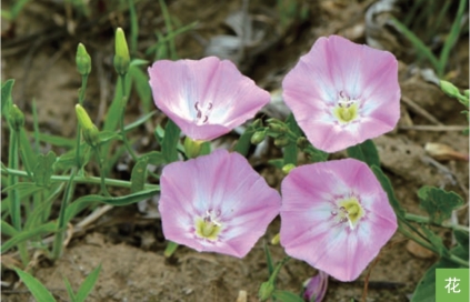 形态特征:多年生草本。根状茎横走。茎平卧或缠绕。叶互生;叶片卵状长圆形至披针形,长3~5厘米,宽1.5~3.5厘米,基部戟形、箭形或心形,顶端钝或具小尖头,全缘或3裂。花通常1~3朵腋生;苞片2枚,线形,长约3毫米,与花远离;萼片5枚,不等长;花冠宽漏斗形,粉红色、白色或白色具粉红的瓣中带或粉红色具白色的瓣中带,5浅裂。蒴果卵状球形或圆锥形,长5~8毫米。种子黑褐色,卵圆形。花期6—8月,果期7—10月。
