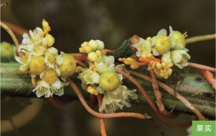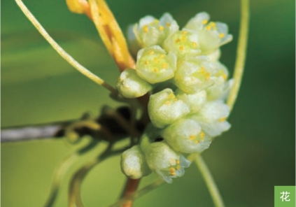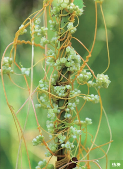 形态特征:一年生寄生草本。茎金黄色,缠绕,纤细,直径1毫米左右,无叶。花于茎侧簇生成聚伞花序或总状花序;苞片及小苞片鳞片状;花萼钟形,5裂,基部连合;花冠乳白色或淡黄色,钟形,5裂,裂片直立。蒴果扁球形,直径3~4毫米,下半部被宿存花冠所包,成熟时不规则开裂。种子淡褐色,卵形,长约1.5毫米。花期6—8月,果期8—10月。