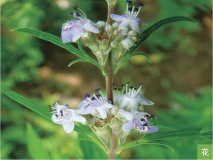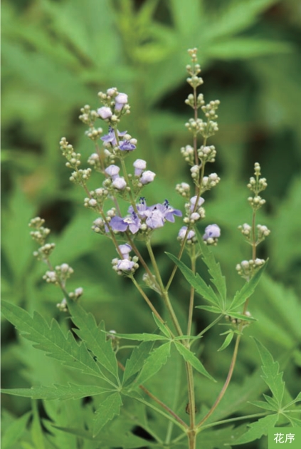 形态特征:落叶灌木或小乔木,高达2米。小枝四棱形,灰褐色。叶对生;掌状复叶具5小叶,稀具3小叶;小叶片长圆状披针形至披针形,边缘有缺刻状锯齿,背面密生灰白色绒毛。聚伞花序排成圆锥花序,顶生;花萼钟状,顶端5齿裂;花冠淡紫色,顶端5裂,二唇形。核果成熟时黑褐色,近球形,直径约2毫米。花期6—7月,果期7—8月。