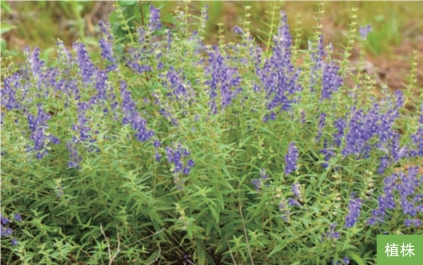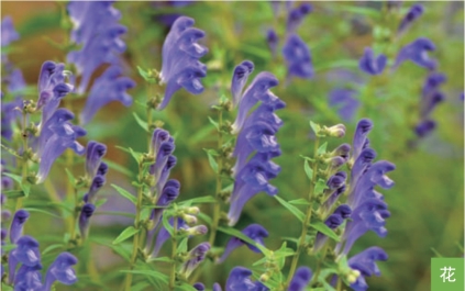 形态特征:多年生草本,高20~60厘米。根肥厚,内部深黄色。茎丛生,直立或斜升,钝四棱形。叶对生;叶片披针形至线状披针形,长1.5~5厘米,宽2~13毫米,基部圆,顶端钝,全缘。总状花序顶生,偏向一侧;花萼二唇形;花冠蓝色或蓝紫色,长2~3.5厘米。小坚果黑褐色,椭圆形,长1.5~2毫米,表面具瘤。花期6—8月,果期8—9月。