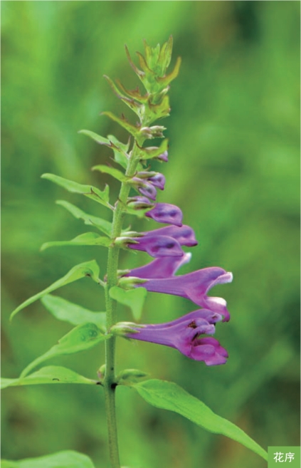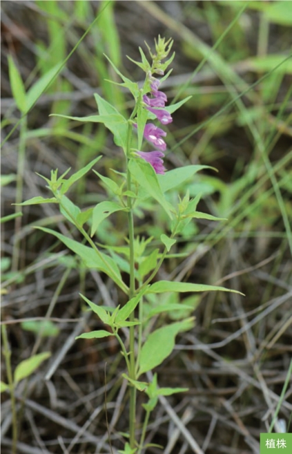 形态特征:一年生草本,高30~80厘米,全株被鳞片状短毛。茎直立,近四棱形。叶对生;叶片披针形至卵状披针形,长2~8厘米,宽0.8~2.5厘米。总状花序顶生;苞叶向上渐小;花萼钟状,萼裂片4枚;花冠紫红色至蓝紫色,长15~20毫米。蒴果卵状,长8~10毫米,被鳞片状毛。种子黑色,长约3毫米。花期7—8月,果期9月。