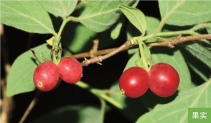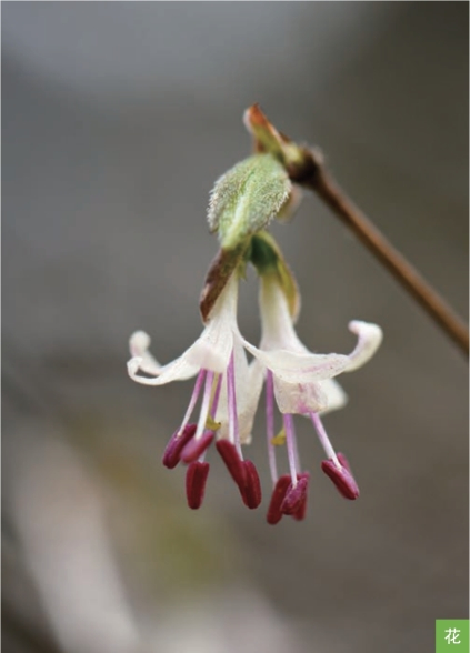 形态特征:落叶灌木,高达2米。树皮灰褐色,不规则开裂。幼枝黄褐色,老枝灰褐色。单叶对生;叶片宽卵形至椭圆形,长4~7厘米,宽2~2.5厘米,两面密被长毛,边缘全缘。花先于叶开放,成对生于叶腋的总花梗上;相邻两萼筒分离,萼片5枚;花冠淡紫色,漏斗状,长约1厘米。浆果红色,球形,直径6~8毫米。种子淡褐色,长圆形,长达4.5毫米。花期4—5月,果熟期5—6月。