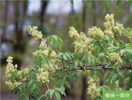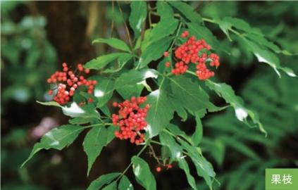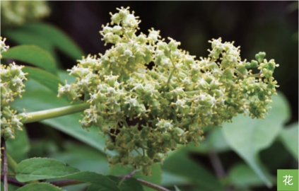 形态特征:落叶灌木或小乔木,高达6米。树皮红灰色。一年生枝微紫灰褐色,老枝淡红褐色。叶对生;基数羽状复叶具小叶3~7枚,长圆形,稀卵状长圆形,长4~9厘米,宽1~3厘米,边缘具不整齐锯齿。圆锥花序顶生;花小而密;萼筒杯状,萼片5枚;花瓣5枚,黄绿色或顶端微紫堇色。浆果状核果,红色,球形,直径4~8毫米。花期5—6月,果熟期7—8月。