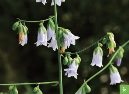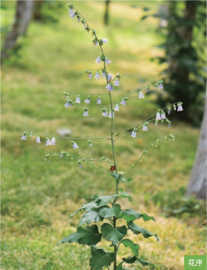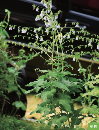 形态特征:多年生草本,高40~120厘米。根肥大。茎直立,稍呈“之”字形弯曲。基生叶心状肾形,宽大于长;茎生叶互生,具长柄,叶片心状卵形,长4~12厘米,宽3~8厘米,基部心形、浅心形或近截形,顶端钝至短渐尖,边缘为单锯齿或重锯齿。圆锥花序;花萼5裂;花冠鲜蓝色、淡蓝紫色或白色,钟状,5浅裂。蒴果卵状圆锥形,长约7毫米,直径约5毫米。种子黄棕色,两端黑色,长圆形,稍扁,长0.8~1.5毫米。花期7—9月,果期9—10月。