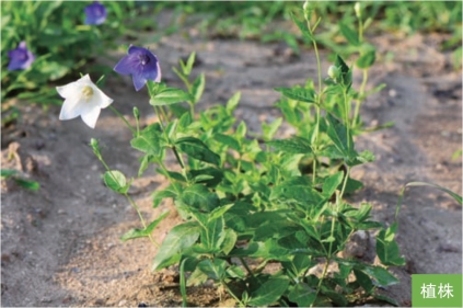 形态特征:多年生草本,高20~120厘米,有白色乳汁。根粗壮,肉质。茎直立,单一或上部分枝。叶轮生或下部叶轮生至全部互生;叶片卵形、卵状椭圆形至披针形,长2~7厘米,宽0.5~4.5厘米,边缘具细锯齿。花单朵顶生或数朵集成假总状花序或圆锥花序;花萼5裂;花冠蓝色、紫色或白色,广钟形,直径3~6厘米。蒴果倒卵形,长1~2.5厘米,直径约1厘米。种子黑褐色,狭卵形,长约2毫米。花期7—9月,果期8—10月。