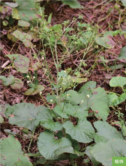 形态特征:多年生草本,高40~90厘米。茎直立,中部以上被蛛丝状绒毛。叶互生;茎下部叶较大,叶片肾形、卵状心形或三角状心形,长6~12厘米,宽9~17厘米,基部下延至柄成宽翼,背面密被蛛丝状毛;茎中部以上叶渐小,菱状卵形至长椭圆状披针形。头状花序排成圆锥状花序;总苞半球形,宽2.5~5毫米;边花雌性,花冠宽钟形,白色;中央花两性,花冠管状钟形,白色。瘦果棍棒状,长6~8毫米,被多数头状具柄的腺毛。花期7—8月,果期8—10月。
