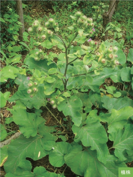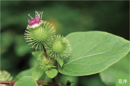 形态特征:二年生草本,高达2米。根肉质。茎直立,通常带紫色。基生叶丛生,有长柄,叶片三角状卵形,长16~50厘米,宽12~40厘米,背面密被白色绵毛;茎生叶与基生叶同形或近同形,向上渐小。头状花序簇生或呈伞房状;总苞球形或卵球形,总苞片多层,顶端具钩刺;花冠红色,管状,顶端5裂。瘦果灰黑色,长圆形或倒卵形,长5~7毫米,宽2~3毫米;冠毛淡黄棕色,刚毛糙毛状。花期7—9月,果期9—10月。