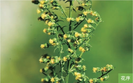 形态特征:一年生草本,高达2米,有浓烈香气。根纺锤形。茎直立,多分枝。叶互生;茎下部叶宽卵形或三角状卵形,长3~7厘米,宽2~6厘米,三回栉齿状羽状深裂;茎中部、上部叶与苞片叶一至二回栉齿状羽状深裂。头状花序近球形,下垂,密集,排成圆锥花序;总苞片3~4层;花黄色,边花雌性,长筒状,顶端2浅裂;中央花两性,管状钟形,顶端5齿裂。瘦果红褐色,长圆形,略扁,长约0.7毫米,宽约0.2毫米。花期8—9月,果期9—10月。