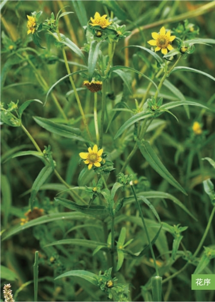 形态特征:一年生草本,高15~90厘米。茎直立,麦秆色或带紫色。叶对生,无柄;叶片长圆形或长圆状披针形,长5~16厘米,宽1~1.5厘米,顶端渐尖,基部半抱茎,边缘具疏锯齿。头状花序单生于茎、枝端,花期下垂;总苞盘状,总苞片2层;边花舌状,雌性,黄色,长8~15毫米;中央花两性,管状。瘦果狭楔形,长5~6.5毫米,具4棱,棱上有倒刺毛,顶端芒刺4枚。花期7—8月,果期9—10月。