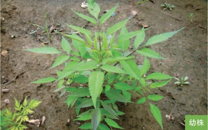 形态特征:一年生草本,高20~120厘米。茎直立,多分枝,常带紫色。叶对生,具柄;叶片一回羽状复叶,具小叶3~5枚;小叶片披针形,长3~10厘米,宽1~3厘米,顶端渐尖,边缘有粗锯齿。头状花序单生茎、枝端;总苞钟状或半球形,总苞片2层;无舌状花或舌状花不发育,管状花两性。瘦果扁平,狭楔形,长5~10毫米,顶端具2枚芒刺。花期8—9月,果期9—10月。