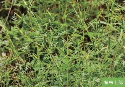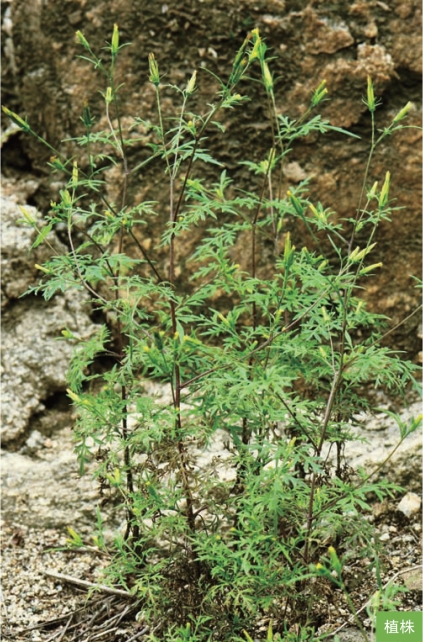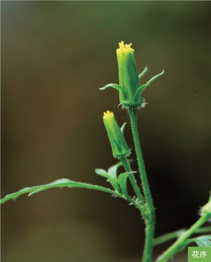 形态特征:一年生草本,高20~90厘米。茎直立,近四棱形。基生叶及茎下部叶花期枯萎;茎中部叶对生,具柄,叶片二至三回羽状全裂,裂片线状披针形;茎上部叶互生,一至二回羽状分裂。头状花序单生于茎、枝端;总苞筒状,总苞片2层;无舌状花,管状花两性。瘦果条形,略具4棱,长13~16厘米,有小刚毛,顶端具芒刺2枚。花期8—9月,果期9—10月。