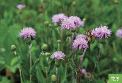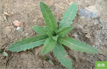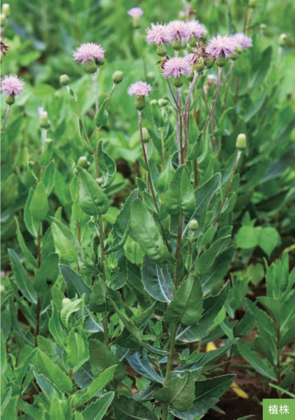 形态特征:多年生草本,高20~50厘米。茎直立,被蛛丝状绵毛。基生叶莲座状,茎生叶互生;基生叶和茎中部叶椭圆形、长椭圆形或椭圆状倒披针形,长4~11厘米,宽0.7~3厘米,全缘或波状缘,边缘有刺,两面被蛛丝状绵毛;茎上部叶渐小。头状花序单性,异型,雌、雄异株,单生茎端或少数至多数头状花序排成伞房花序;小花紫红色。瘦果淡黄色,椭圆形或卵形,压扁,长约3毫米。花果期6—9月。