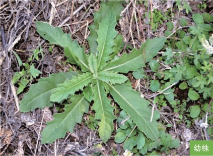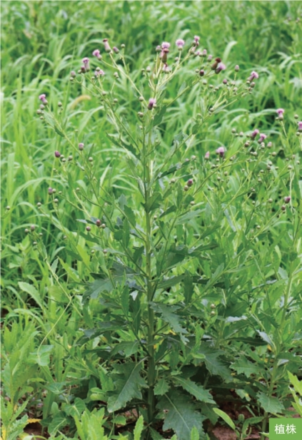 形态特征:多年生草本,高达2米。茎直立,上部多分枝。基生叶莲座状,茎生叶互生;茎生叶叶片长圆状披针形或披针形,长6~15厘米,宽2~4厘米,边缘具羽状缺刻状牙齿或羽状浅裂,边缘有刺;茎上部叶渐小,微有齿或全缘。头状花序单性,异型,雌、雄异株,多数,密集,排成伞房花序;小花紫红色。瘦果淡黄色,椭圆形或卵形,压扁,长约3毫米。花果期7—9月。