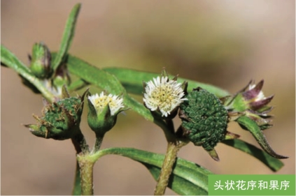 形态特征:一年生草本,高达60厘米,全株被短糙伏毛。茎直立,斜升或平卧。叶对生;叶片长圆状披针形或披针形,长1.5~6厘米,宽0.5~2厘米。头状花序;总苞球状钟形,总苞片2层;边花雌性,舌状,白色;中央花两性,花冠管状,白色。边花的瘦果暗褐色,三棱形,长约3毫米;中央花的瘦果扁四棱形,顶端截形,边缘具白色的肋。花果期7—10月。