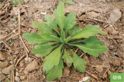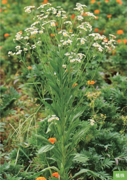 形态特征:一年生草本,高达1米。茎直立,上部有分枝。基生叶莲座状,茎生叶互生;基生叶及茎下部叶叶片长圆形或宽卵形,长3~4.5厘米,宽1~1.5厘米,边缘具齿;茎中部和上部叶较小,长圆状披针形或披针形,长3~7厘米,宽0.5~2厘米,边缘有齿或近全缘;最上部叶线形,全缘。头状花序多数,排列成疏圆锥花序;总苞半球形,总苞片3层;边花雌性,舌状,白色或淡蓝色;中央花两性,管状,黄色。瘦果长圆形,扁,长约1.2毫米。花期7—8月,果期8—9月。