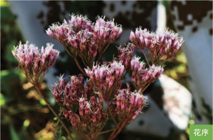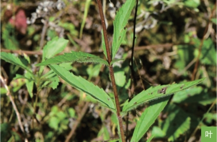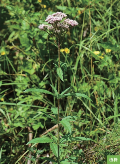 形态特征:多年生草本,高达1.5米。茎直立,通常单一。叶对生;叶片披针形或线状披针形,长7~10厘米,宽0.5~2厘米,不裂或3裂,基出三脉,两面粗糙,边缘具疏齿。头状花序密集成复伞房花序;总苞圆柱状,总苞片3层,苞片绿色或紫红色;花白色、粉红色或淡紫红色。瘦果黑褐色,长2毫米,椭圆状,5棱。花果期7—9月。