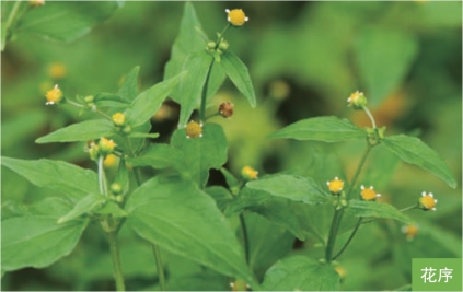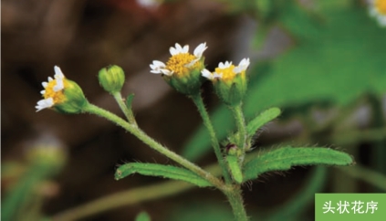 形态特征:一年生草本,高0.1~1米。茎直立,纤细。叶对生;叶片卵形或长圆状卵形,长1.5~4厘米,宽1~3厘米,边缘具钝齿,基出三脉。头状花序,多数,排成聚伞花序;总苞半球形,总苞片2层;边花舌状,5枚,白色,顶端3齿裂;中央花管状,花冠黄色。瘦果黑色或黑褐色,倒卵状锥形,三棱,长1~1.5毫米。花果期7—10月。