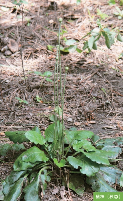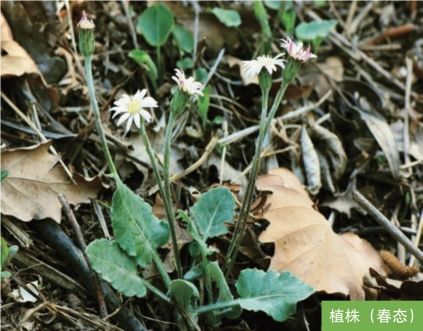 形态特征:多年生草本,植株具春、秋二型,全株被白色绵毛。春型高5~15厘米;叶基生,莲座状;叶片长圆状卵形、卵形或近圆形,长1~6厘米,宽1~4厘米,基部心形,顶端微尖,边缘具齿、深波状或琴状羽裂。头状花序单生于花葶顶端;总苞狭钟形,总苞片3层;边花雌性,舌状,淡紫色;中央花两性,花冠管状二唇形。瘦果纺锤形,具纵棱,被白色粗毛,长5~6毫米。花果期5—7月。秋型高30~80厘米,叶片大。头状花序大,无舌片。花果期8—10月。