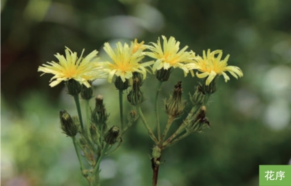 形态特征:二年生草本,高30~120厘米。茎直立,单一,上部分枝,密被钩状硬毛。基生叶莲座状,茎生叶互生;基生叶花期枯萎;茎下部叶披针形、椭圆状披针形,长8~20厘米,宽1~4厘米,两面被分叉的钩状硬毛;茎中上部叶渐小。头状花序多数,排成聚伞状;总苞圆柱状钟形,总苞片3层,黑绿色;舌状花黄色。瘦果棕褐色,椭圆形,长3~5毫米,有纵肋。花期7—9月,果期8—10月。