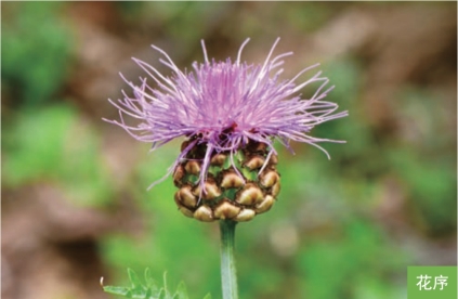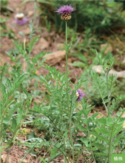 形态特征:多年生草本,高20~100厘米。根肥厚,直伸。茎直立,不分枝,密被灰白色绒毛。叶互生;叶片长15~25厘米,宽4~6厘米,羽状深裂至浅裂,裂片6~10对,边缘具不规则牙齿,两面被白色长柔毛;茎上部叶渐小。头状花序大,单生茎顶,直径5~7厘米;总苞半球形,总苞片约9层,顶端具膜质附属物,浅褐色。管状花两性,淡紫色或紫红色。瘦果淡褐色,倒圆锥形,长约5毫米。花期5—6月,果期6—7月。