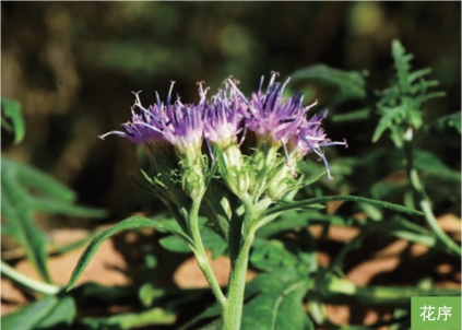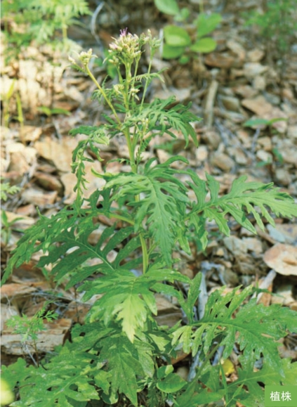 形态特征:多年生草本,高约70厘米。茎直立,单生,上部分枝。叶互生;基生叶及茎下部叶有长柄,叶片长圆状卵形,长7~15厘米,宽3~5厘米,栉齿状羽状深裂至近全裂,侧裂片7~13对;茎上部叶渐小。头状花序排成复伞房花序;总苞狭筒状,总苞片5层,外层及中层苞片边缘有栉齿;小花淡紫色。瘦果淡紫褐色,圆柱状,长约5毫米。花期8—9月,果期9—10月。